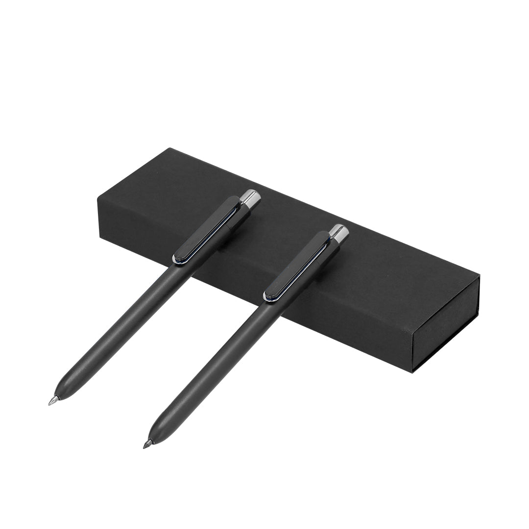 Ambos os produtos possuem um mecanismo de pressão, garantindo facilidade de uso e conforto. O design elegante inclui um clipe combinando e detalhes cromados que adicionam um toque de sofisticação. Este conjunto é apresentado em um estojo de papelão reciclado na cor preta, tornando-o uma escolha eco-friendly e moderna. Com o distintivo de RABS impresso, este conjunto é uma excelente opção para quem valoriza qualidade e responsabilidade ambiental.