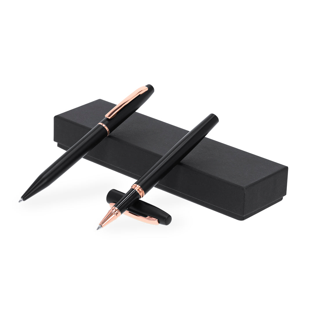 Descubra a combinação perfeita de sustentabilidade e elegância com este conjunto de caneta esferográfica e caneta roller, confeccionadas em alumínio reciclado. O design sofisticado em preto fosco, realçado por acabamentos em ouro rosa, transforma cada escrita em uma experiência premium.
