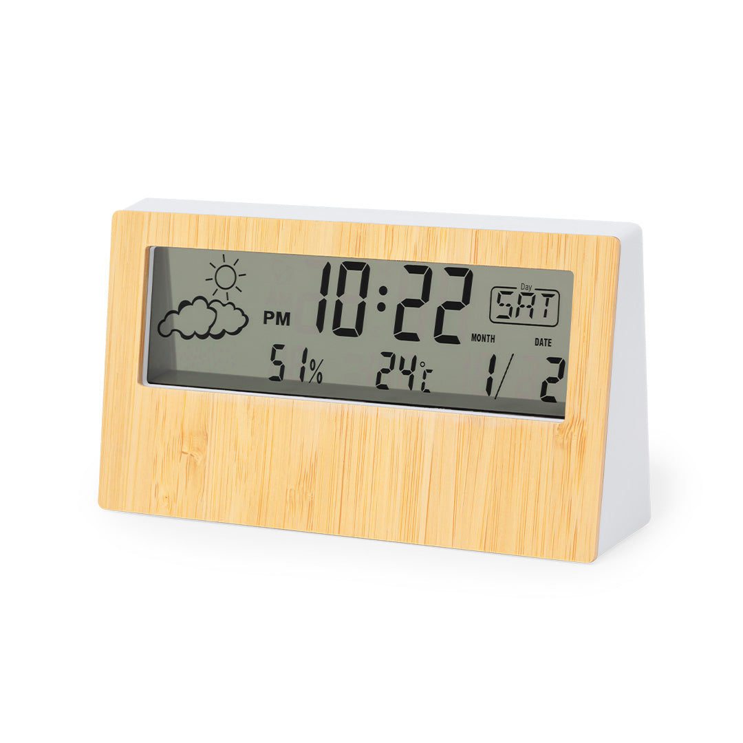 Descubra a nossa estação meteorológica com um toque natural, com frente em bambu. Este dispositivo não só mede a temperatura e a humidade, como também oferece a função de calendário e alarme, tornando-o um acessório prático e funcional para qualquer ambiente.